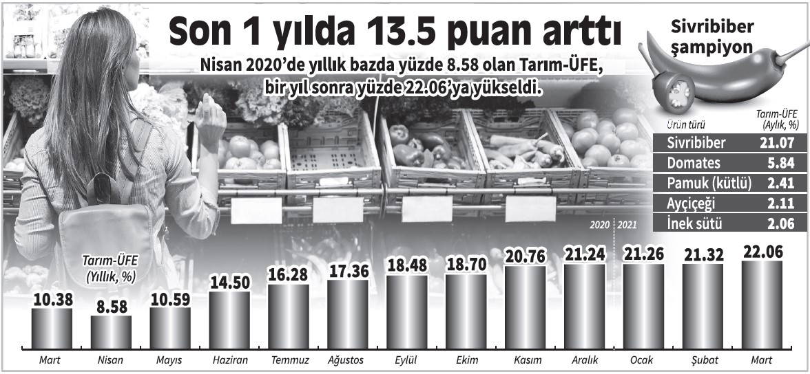 “Tarım Ürünleri Üretici Fiyat Endeksi, Mart 2021” raporuna göre, Tarım-ÜFE’de artış bir önceki aya (aylık) göre yüzde 2.52, aralık ayına (3 aylık) göre yüzde 8.39, 2020’nin aynı ayına (yıllık) göre yüzde 22.06 ve 12 aylık ortalamalara göre yüzde 17.68 oldu. Ana ürün grubu bazında yıllık en fazla artış ise yüzde 38.68 ile lifli bitkiler, yüzde 38.65 ile turunçgiller ve yüzde 30.62 ile canlı kümes hayvanları ve yumurtalar izliyor. Tarım-ÜFE’deki bu artışların önümüzdeki dönemde TÜFE’yi de etkilemesi bekleniyor.