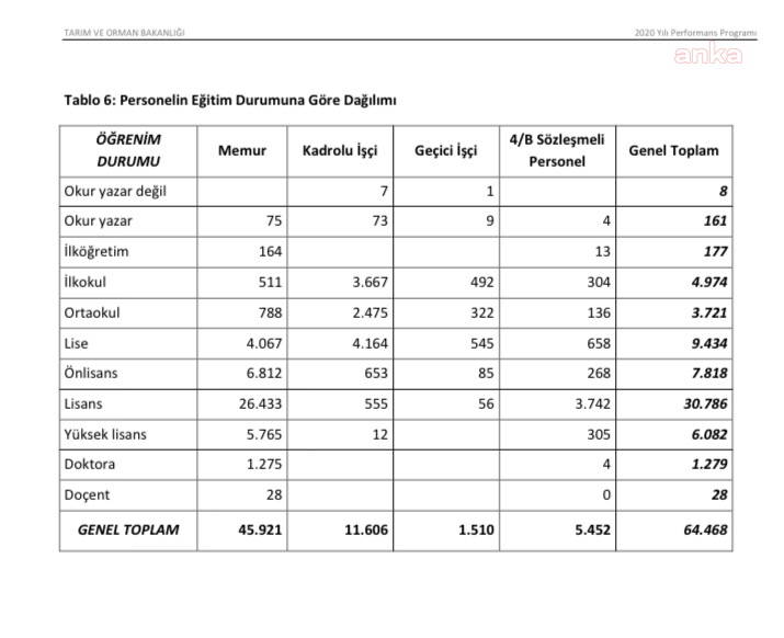 Tarım ve Orman Bakanlığı’nın 2020 Yılı Performans Programı’na göre Bakanlık ve birimlerinde toplam 64 bin 648 personel çalışıyor. Bakanlık personelinin eğitim durumuna göre dağılımı dikkat çekiyor. Bakanlıkta 7’si kadrolu biri geçici olmak üzere toplamda 8 okur-yazar olmayan işçi görev yapıyor.