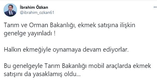 Genelgeyi sosyal medya hesabından paylaşan İBB İYİ Parti Grup Başkan Vekili İbrahim Özkan, " Tarım ve Orman Bakanlığı, ekmek satışına ilişkin genelge yayınladı! Halkın ekmeğiyle oynamaya devam ediyorlar. Bu genelgeyle Tarım Bakanlığı mobil araçlarda ekmek satışını da yasaklamış oldu" ifadelerini kullandı.