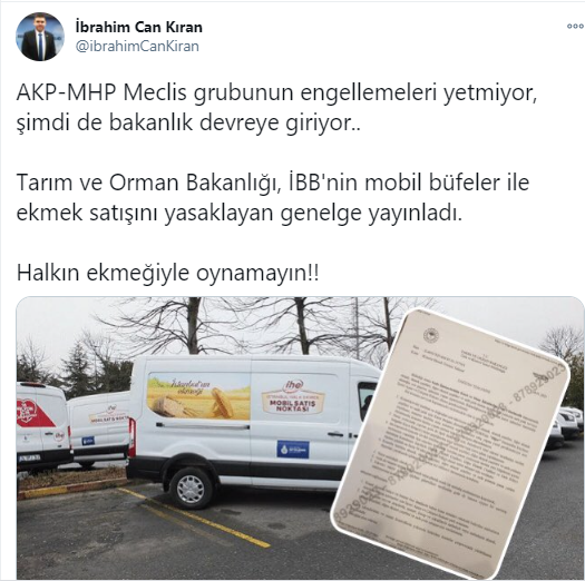 "AKP-MHP Meclis grubunun engellemeleri yetmiyor, şimdi de bakanlık devreye giriyor.Tarım ve Orman Bakanlığı, İBB'nin mobil büfeler ile ekmek satışını yasaklayan genelge yayınladı. Halkın ekmeğiyle oynamayın! Kızılay’ın böyle dağıtım yapmasına sesi çıkmayan Tarım Orman Bakanlığı İstanbul Halk Ekmek'in mobil büfelerini yasaklamış."