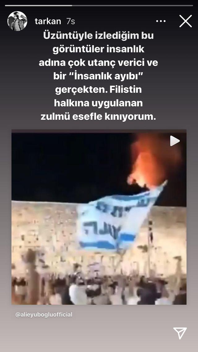 Tarkan, Instagram'dan yaptığı paylaşımda İsrail'in Filistin'e yönelik saldırılarını esefle kınadığını belirtti. Ünlü sanatçı, saldırılar için 'insanlık ayıbı' ifadesini kullandı.
