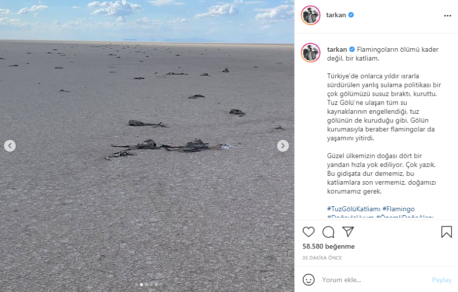 Yüzlerce flamingonun ölümü sosyal medyada geniş yankı bulurken, yaşananlara ilişkin bir tepki de Tarkan'dan geldi.