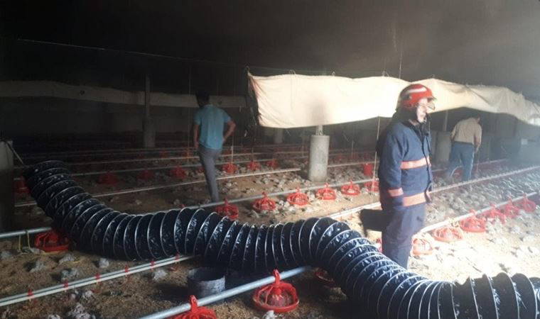 Sakarya'nın Karasu ilçesine bağlı Karanlıkdere Mahallesi'nde Muhammet K.'ye ait tavuk çiftliğindeki kümeste henüz belirlenemeyen nedenle yangın çıktı.