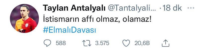 Galatasaray, Onur Haftası’nı tişörtüyle kutladığı için hedef haline getirilen futbolcusu Taylan Antalyalı, tüm Türkiye'nin tepkisine neden olan ve yaşanan çocuk istismarı ile yürekleri dağlayan Elmalı Davası'yla ilgili sosyal medya hesabından açıklama yaptı. #ElmalıDavası etiketiyle, "İstismarın affı olmaz, olamaz!" Twitini paylaşan Antalyalı'ya büyük destek geldi.