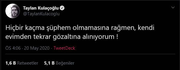Bugün Twitter üzerinden yaptığı bir paylaşımda tekrar gözaltına alındığını söyleyen Kulaçoğlu, "Hiçbir kaçma şüphem olmamasına rağmen, kendi evimden tekrar gözaltına alınıyorum" dedi.