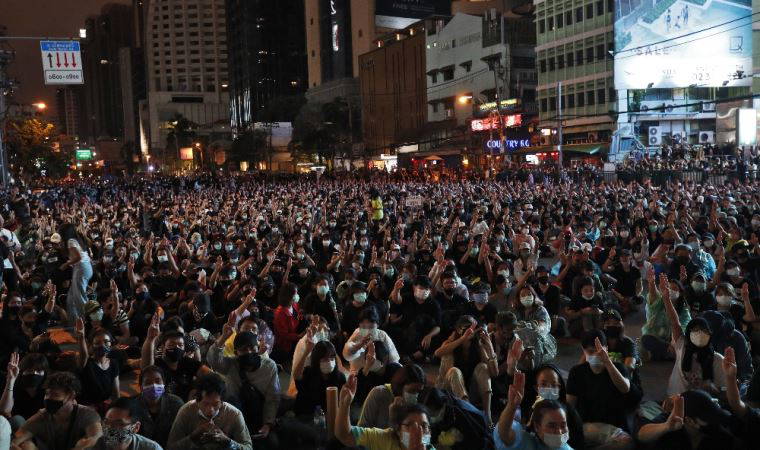Tayland’daki hükümet ve monarşi karşıtı protestolar devam ediyor. Başkent Bangkok’ta ilan edilen acil durum kararına rağmen binlerce kişi başkent sokaklarını ele geçirdi. Göstericiler, başkentteki önemli kavşaklarda bir araya gelirken, Bangkok’un en önemli ulaşım merkezlerinden ikisi olan Zafer Anıtı ve Asok’u ele geçirdi.