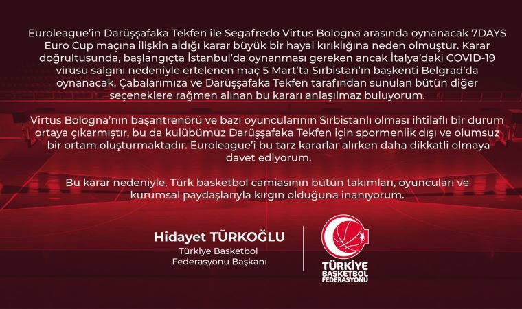 7Days Eurocup Son 16 Turu B Grubu'nda İstanbul'da oynanması planlanan Darüşşafaka Tekfen-Segafredo Virtus Bologna maçı, Euroleague yönetiminin aldığı karar ile Sırbistan'ın başkenti Belgrad'a alındı. TBF Başkanı Hidayet Türkoğlu, federasyonun internet sitesi üzerinden yaptığı açıklamada şu ifadelere yer verdi: “Euroleague’in Darüşşafaka Tekfen ile Segafredo Virtus Bologna arasında oynanacak 7DAYS Euro Cup maçına ilişkin aldığı karar büyük bir hayal kırıklığına neden olmuştur. Karar doğrultusunda, başlangıçta İstanbul’da oynanması gereken ancak İtalya’daki COVID-19 virüsü salgını nedeniyle ertelenen maç 5 Mart’ta Sırbistan’ın başkenti Belgrad’da oynanacak. Çabalarımıza ve Darüşşafaka Tekfen tarafından sunulan bütün diğer seçeneklere rağmen alınan bu kararı anlaşılmaz buluyorum. Virtus Bologna’nın başantrenörü ve bazı oyuncularının Sırbistanlı olması ihtilaflı bir durum ortaya çıkarmıştır, bu da kulübümüz Darüşşafaka Tekfen için sportmenlik dışı ve olumsuz bir ortam oluşturmaktadır. Euroleague’i bu tarz kararlar alırken daha dikkatli olmaya davet ediyorum. Bu karar nedeniyle, Türk basketbol camiasının bütün takımları, oyuncuları ve kurumsal paydaşlarıyla kırgın olduğuna inanıyorum.”
