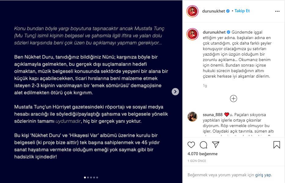 “Bu kişi ‘Nükhet Duru’ ve ‘Hikayesi Var’ albümü üzerine kurulu bir belgeseli (ki proje bize aittir) tek başına sahiplenmek ve 45 yıldır sanat hayatıma vermekte olduğum emeği yok saymak gibi bir hadsizlik içindedir!” diyen Nükhet Duru, "Belgeselde senaryo olmadığı halde montajda adını belgesele senarist yazdıracak kadar hukuk tanımazlık edebilmiştir" ifadelerini kullandı.