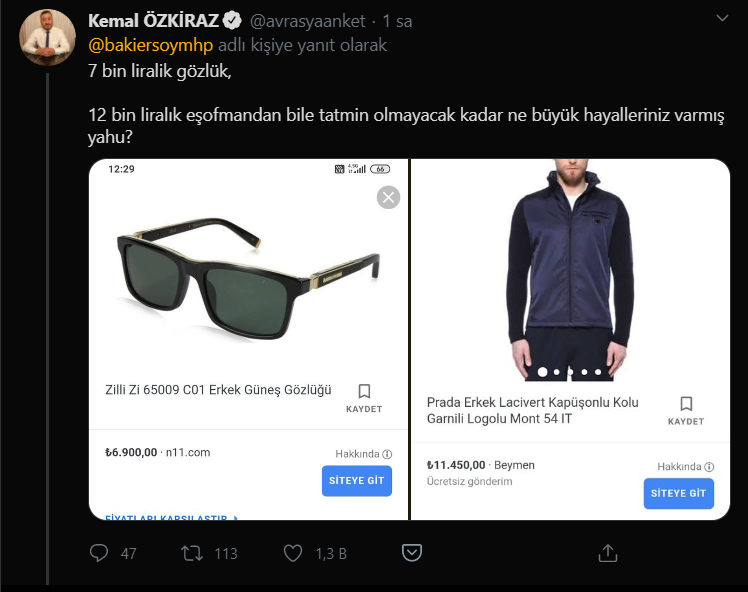 Tehditin ardından Ersoy'un bu sabah yaptığı twitter paylaşımında üstündeki 12 bin liralık Prada eşofman ve 7 bin liralık gözlükle görünmesi sosyal medyada gündem oldu.