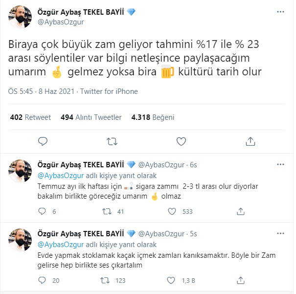 Tekel Bayileri Platformu (TBP) Başkanı Özgür Aybaş, sosyal medya hesabından paytığı paylaşımda, söz konusu zammın ‘yüzde 17 ile yüzde 23 arasında olacağına dair söylentiler olduğunu’ kaydederek, “Umarım gelmez yoksa bira kültürü tarih olur” diye yazdı.