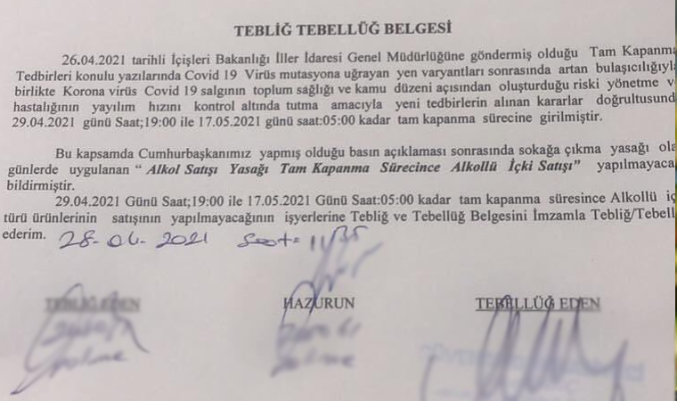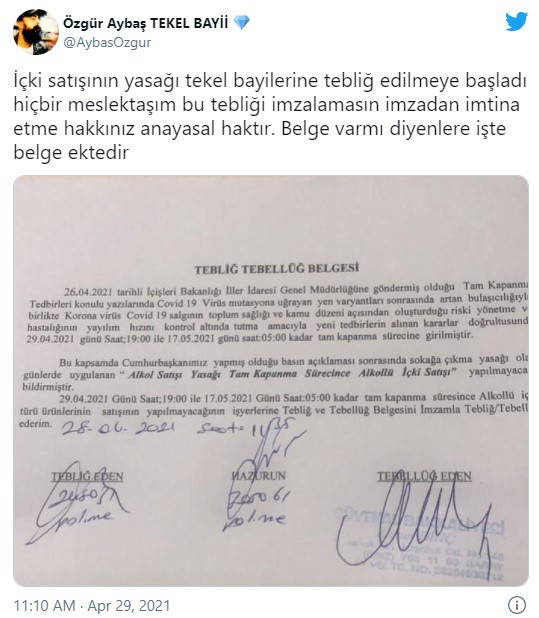 Polislerin tekel bayilere içki satışı yapmayacaklarına dair imzalattığı tebliği belgesi sosyal medyada büyük yankı uyandırdı. Türkiye Tekel Bayiler Platformu Başkanı Özgür Aybaş, söz konusu tebliğin yasal bir dayanağı olmadığını belirterek, bayilere 'İmzalamayun' çağrısında bulundu.