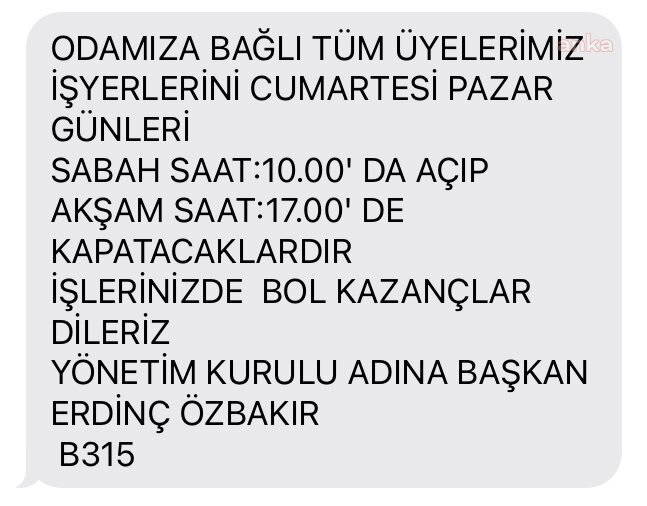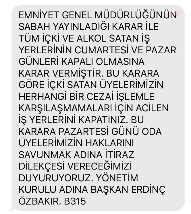 Mesajda, Emniyet Genel Müdürlüğü’nün tüm içki ve alkol satan iş yerlerinin hafta sonu kapalı olmasına karar verdiği öne sürülerek, üyelerinin cezai işlem ile karşılaşmamaları için iş yerlerinin “acilen” kapatılması gerektiği belirtildi.