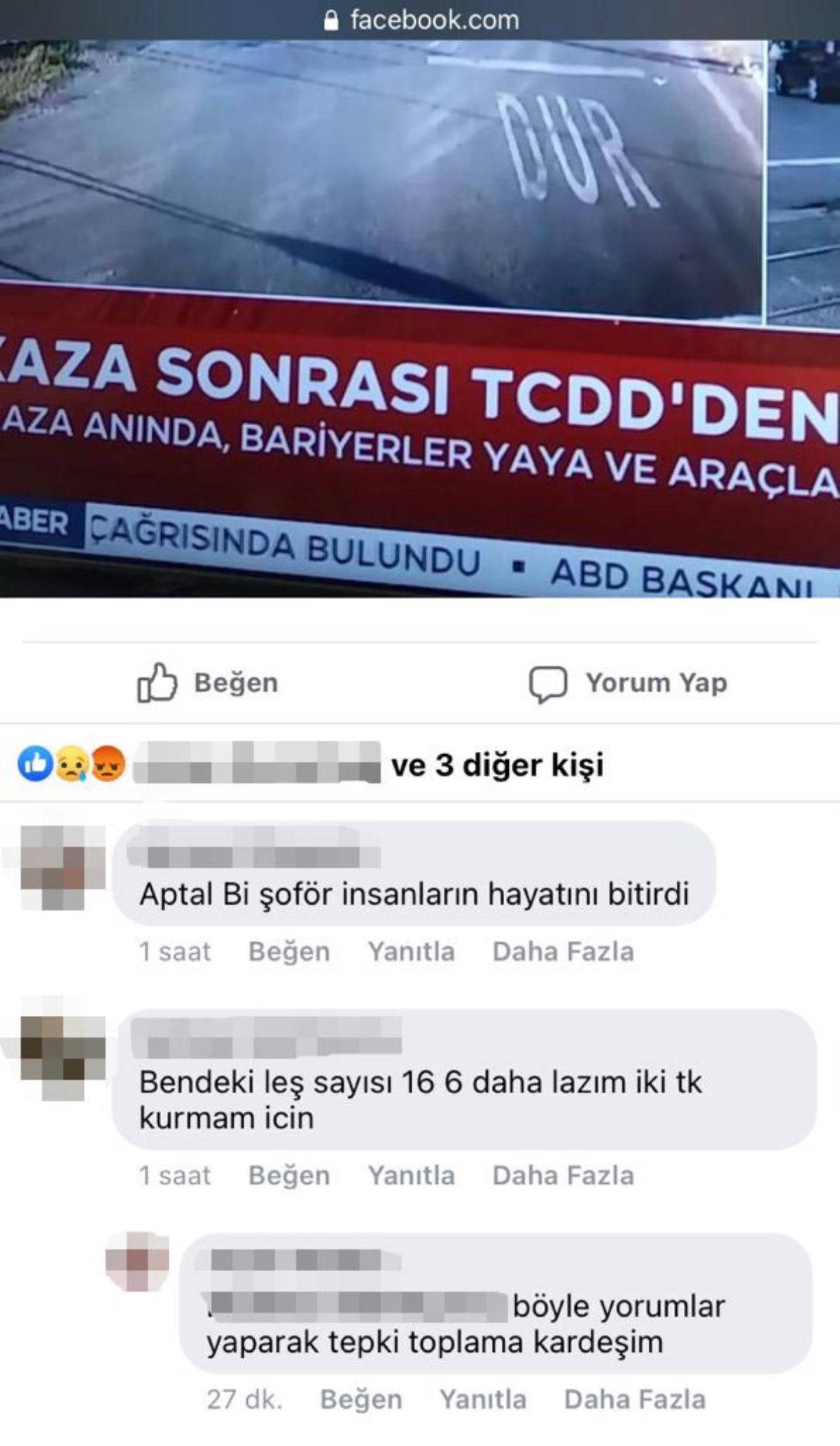 Kaza sonrası sosyal medya kullanıcıları da üzüntülerini dile getirirken, Türkiye Cumhuriyeti Devlet Demiryolları’nda (TCDD) görevli olan ve İzmir'de çalıştığı öğrenilen M.A.K.nin yaptığı yorum ise dikkat çekti. M.A.K. yaptığı yorumda, "Bendeki leş sayısı 16, 6 daha lazım iki takım kurmam için" ifadelerine yer verdi.