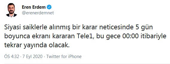 "Siyasi saiklerle alınmış bir karar neticesinde 5 gün boyunca ekranı kararan Tele1, bu gece 00:00 itibariyle tekrar yayında olacak."