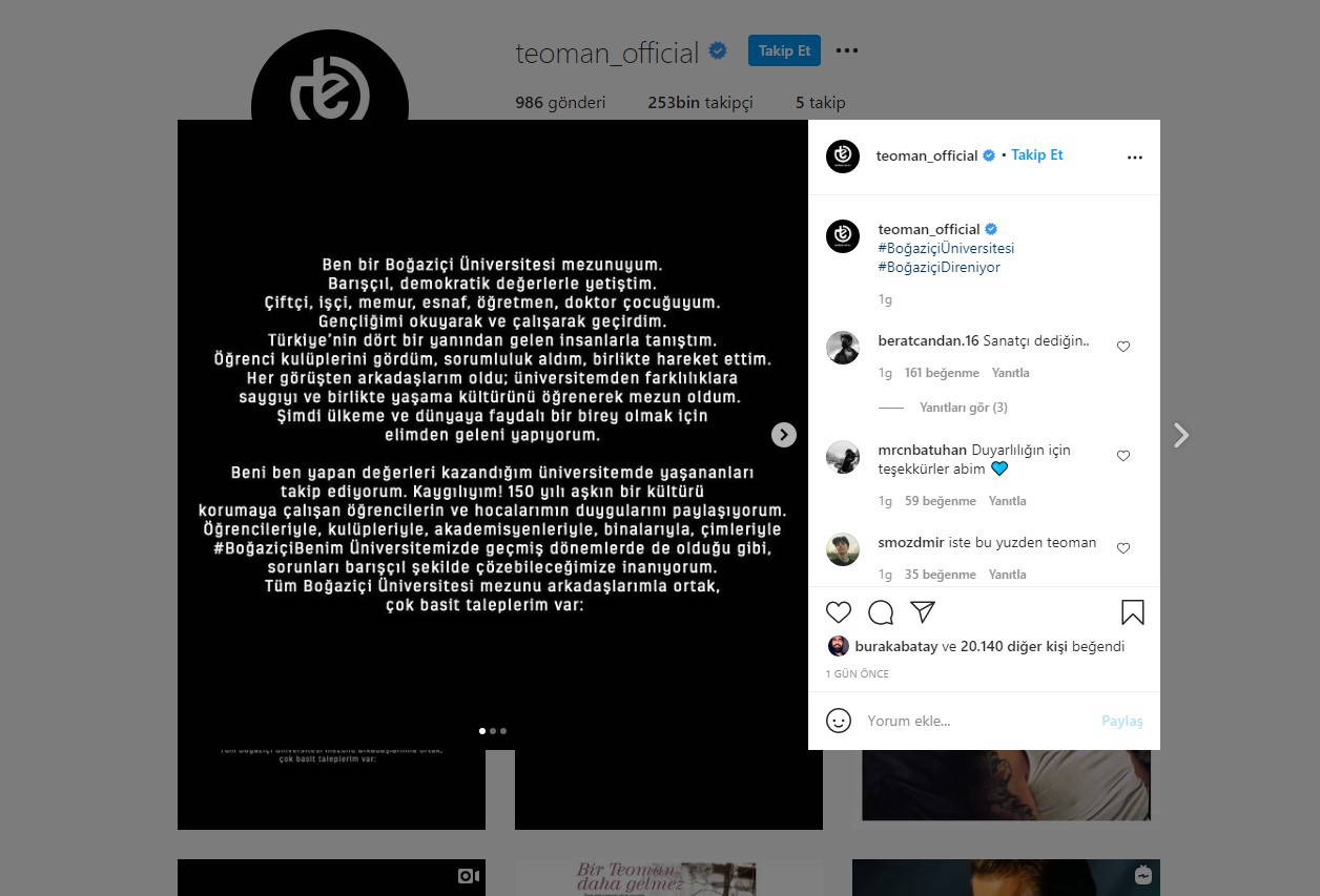 Teoman’ın Instagram hesabımdan yayımladığı açıklama şöyle: