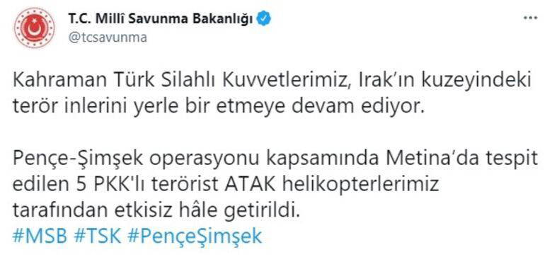 MSB'den yapılan açıklamada, "Kahraman Türk Silahlı Kuvvetlerimiz, Irak’ın kuzeyindeki terör inlerini yerle bir etmeye devam ediyor. Pençe-Şimşek operasyonu kapsamında Metina’da tespit edilen 5 PKK'lı terörist ATAK helikopterlerimiz tarafından etkisiz hâle getirildi" denildi.