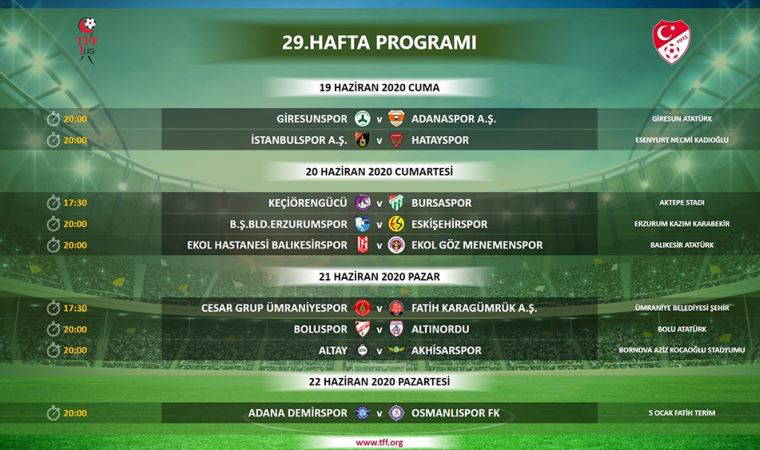 Korona virüs tedbirleri kapsamında ertelenen TFF 1. Lig karşılaşmalarının programı belli oldu. Türkiye Futbol Federasyonu’nun resmi internet sitesinden duyurulan programa göre, 29. hafta; 19 Haziran Cuma günü Giresunspor - Adanaspor ve İstanbulspor - Hatayspor müsabakalarıyla başlayacak. Federasyon ayrıca 30, 31 ve 32. hafta maçlarının planlamasını da ilan etti.