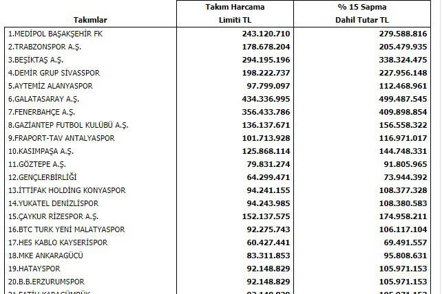 Kulüplerin harcama limitleri, yüzde 15'lik sapma payıyla açıklandı.
