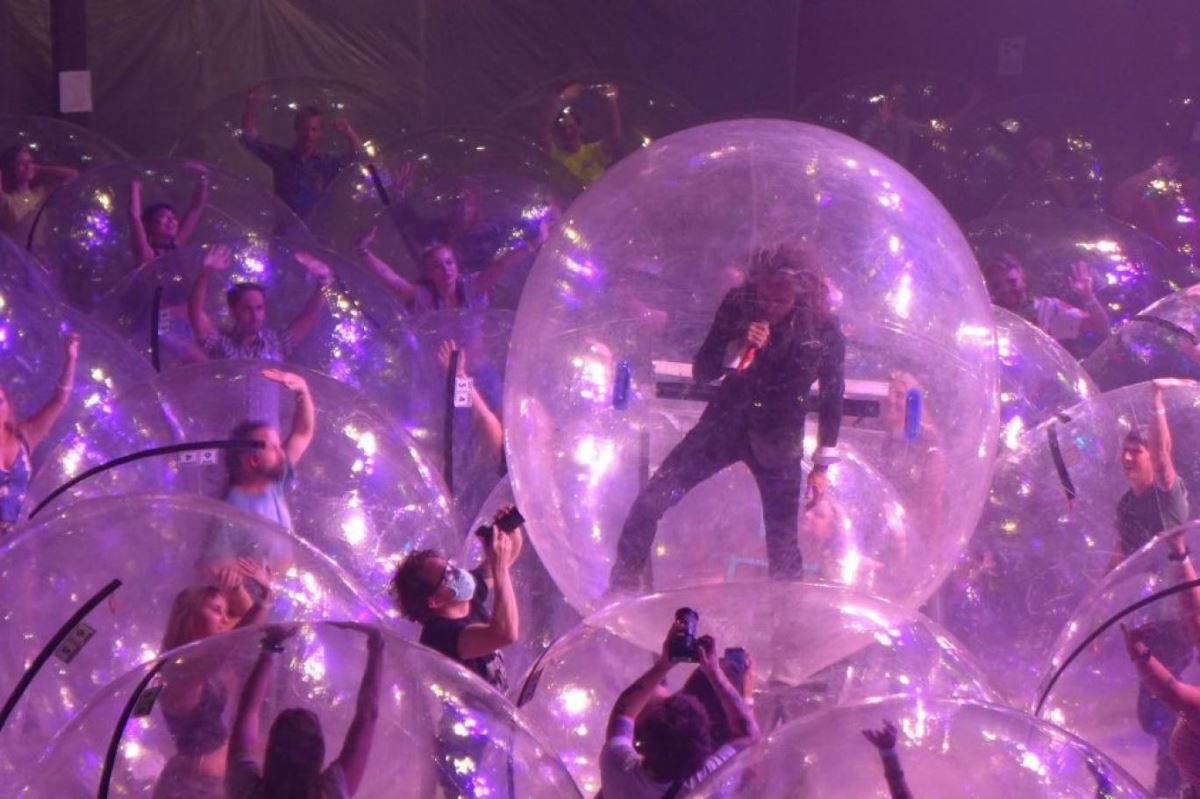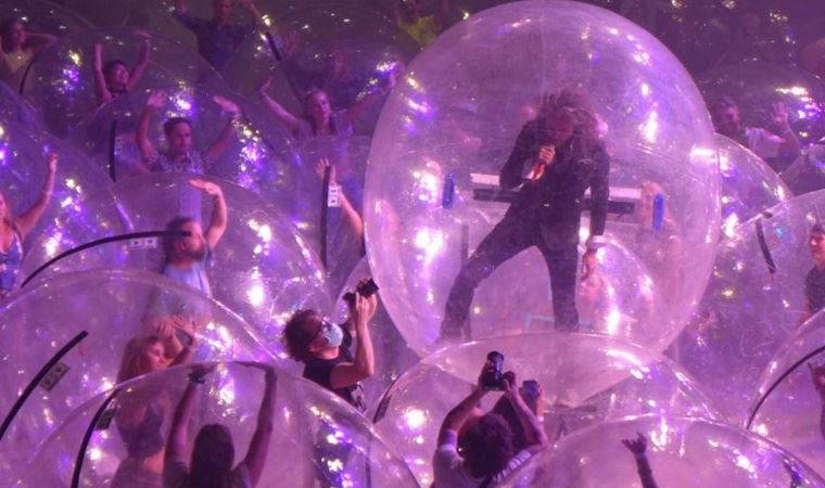 Konserde, hem grup üyeleri hem de seyirciler büyük baloncukların içine girdi.