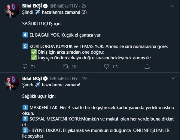 Ekşi, “Şimdi uçuşa hazırlanma zamanı. Sağlıklı uçuş için el bagajı yok, küçük el çantası var. Koridorlarda kuyruk ve temas yok. Anons ile sıra numarasına göre, biniş için arka sıradan öne doğru, iniş için önden arkaya doğru sırasını bekleyerek anons ile. Maskeni tak. Her dört saatte bir değiştirecek kadar yanında yedek masken olsun. Sosyal mesafeni koru, mümkün ve makul olan her yerde buna dikkat et. Hijyene dikkat, el yıkamak ve mümkün olduğunca online işlemler ile seyahat” diye paylaşımlarda bulundu.