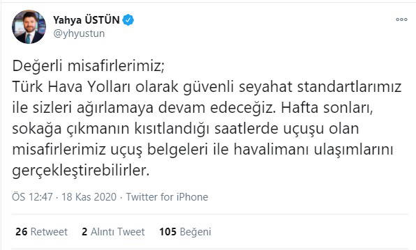 "Değerli misafirlerimiz; Türk Hava Yolları olarak güvenli seyahat standartlarımız ile sizleri ağırlamaya devam edeceğiz. Hafta sonları, sokağa çıkmanın kısıtlandığı saatlerde uçuşu olan misafirlerimiz, uçuş belgeleri ile havalimanı ulaşımlarını gerçekleştirebilirler" denildi.