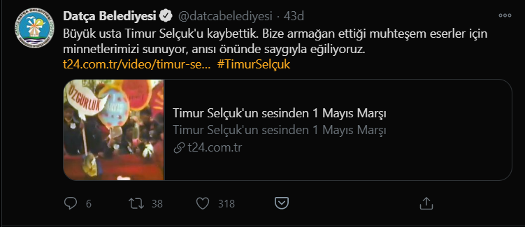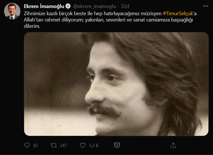 "Zihnimize kazılı birçok beste ile hep hatırlayacağımız müzisyen #TimurSelçuk'a Allah'tan rahmet diliyorum; yakınları, sevenleri ve sanat camiamıza başsağlığı dilerim."