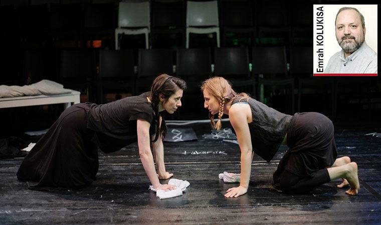 Oyunu sahneye koyan Hakan Emre Ünal “Hizmetçiler”i adeta yeniden yazarak zor bir işe kalkışmış ama son tahlilde bu meydan okumayı başarıyla göğüslemiş. Genet’nin metni zaten her türlü zaman kaymasını kaldıracak bir içeriğe sahip ve karakterler üzerindeki farklı yorumlara da (çok saçma sapan, kaba bir yoruma yönelmediğiniz sürece) izin verecek bir yapısı var. “Tırnak İçinde Hizmetçiler”, Genet’nin metnini günümüze taşıyor ve oyunun ‘oyun içinde oyun’ esprisinden de hareketle iki kız kardeşi aynı evi paylaşan iki genç oyuncu olarak karşımıza çıkarıyor. Nezaket Erden ve Pınar Güntürkün’ün canladırdığı İpek ve Bahar “Hizmetçiler”i prova çalışan iki oyuncuyu canlandırırken, kendileriyle birlikte oturan ama hızla üne kavuştuğu için artık ortalarda görünmeyen Yıldız da aslında orijinal oyundaki Hanımefendi karakterinin yerini alıyor aslında. Oyunu izlediğinizde bana hak vereceğinizi düşünüyorum, uyarlama ve sahneleme sırasında bulunan çözümlerin büyük bir kısmı çok iyi gerçekten de. Nezaket Erden başta olmak üzere iki oyuncunun titiz performansları ve muhtemelen doğaçlamayla oyuna yaptıkları katkı ise oyunu bir üst seviyeye taşıyan unsur olmuş açıkçası.