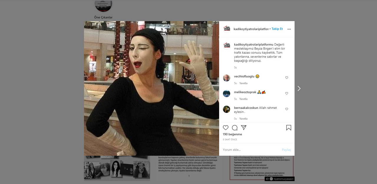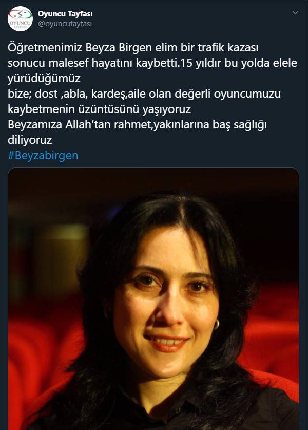 Beyza Birgen'in ölüm haberi, 15 yıldır görev yaptığı Oyuncu Tayfası tiyatro grubunun sosyal medya hesabından şu ifadelerle duyuruldu:
