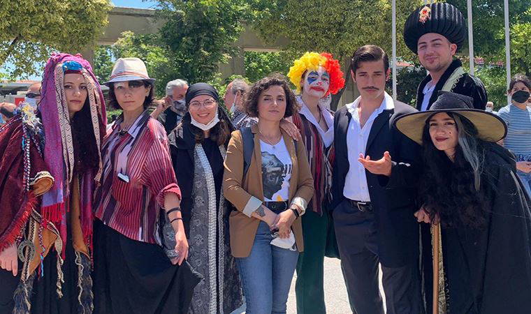 Müzisyenler enstrümanlarıyla eylem yaparken, Ortadirek Tiyatrosu’ndan oyuncular sahne kostümleriyle mesaj verdiler.