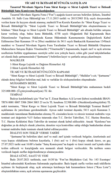 Muhtelif Fon Kurulu Kararları ile “Sürat Kargo Ticari ve İktisadi Bütünlüğü” ile “Sürat Lojistik Ticari ve İktisadi Bütünlüğü”nün oluşturulmasına ve bilahare “Sürat Kargo ve Sürat Lojistik Ticari ve İktisadi Bütünlüğü” adı altında birlikte satışına karar verilmiş olup, bahse konu bütünlük, Bankacılık Kanunu’nun 134’üncü maddesi ve Tasarruf Mevduatı Sigorta Fonu Tarafından Ticari ve İktisadi Bütünlük Oluşturan Mahcuzların Satışına İlişkin Yönetmelik kapsamında, kapalı zarf ve açık artırma usullerinin birlikte uygulanması suretiyle cebri icra yoluyla haciz, rehin gibi yasal takyidatlardan ari olarak ihale şartnamesinde belirtilen kayıt ve şartlarla satışa çıkarılmıştır.