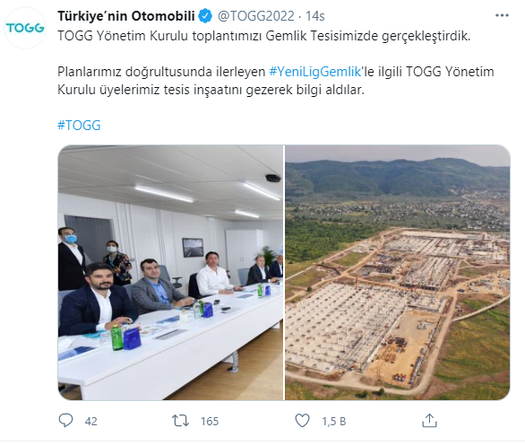 Türkiye'nin Otomobili TOGG2022, Twitter hesabından fabrikanın son halini "TOGG Yönetim Kurulu toplantımızı Gemlik Tesisimizde gerçekleştirdik. Planlarımız doğrultusunda ilerleyen #YeniLigGemlik'le ilgili TOGG Yönetim Kurulu üyelerimiz tesis inşaatını gezerek bilgi aldılar" sözleriyle paylaştı.