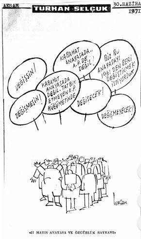 Doğrusunu isterseniz dünya çapında en büyüklerden mizah ustamıza izana, vicdana sığmayan işkencelerin ayrıntılarını paylaşmaktan çok, nedenleri üzerinden kendi değerlendirmeleri ile kendi sözcükleri ile unutamadığı insanca buluşmalara ilişkin kimi sahneler ile en çok da çizgileriyle anlatıklarına dayalı, kanıtları vermeyi, paylaşmayı yeğlerim.. Öncelikle çok yalın anlayabilmek adına 9 Nisan 1971 tarihinde Akşam’da yayımlanmış karikatürüne, yüreğinin, sanatının gücüne bir bakın hele.. Ya böylesine ağır işkencelerden sonra yoluna devam deyişinin kanıtları, şimdilerde Akşam arşivini inceleyemediğimiz için tarihlerini de veremediğimiz şu iki karikatüre birden ne demeliyiz? Ya 30 Haziran günü yine Akşam’da yayımlanmış, “27 Mayıs Anayasa ve Özgürlük Bayramı” üzerinden sorgulamasına ne demeli?