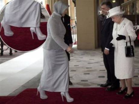 İngiltere’nin bulvar gazetesi Daily Mail, Buckhingham Sarayı’ndaki davette Kraliçe Elizabeth’in Hayrünnisa Gül’ün 15 santimetrelik topuğuna baktığı kareyi manşetine taşıdı.