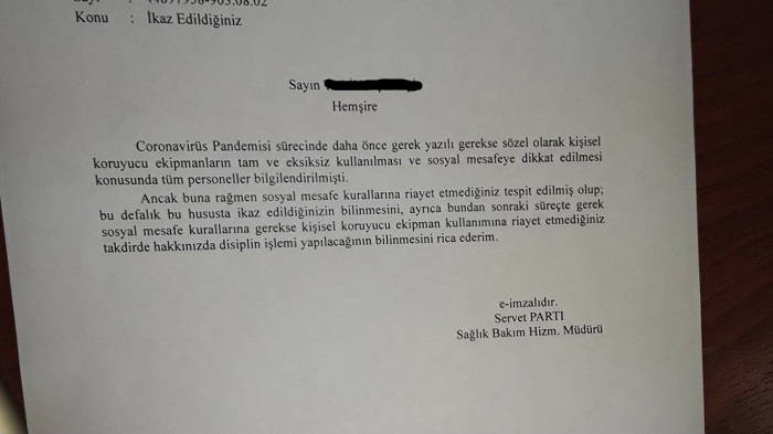 Baş hemşirenin e-imzası ile gelen yazıda, sağlık çalışanlarının testi pozitif çıktığı için uyarıldıkları görüldü. "İkaz edildiğiniz halde kurallara uymadınız, bir daha olursa hakkınızda disiplin işlemi başlatacağız" denilen yazıyı alan sağlık çalışanları isyan etti.
