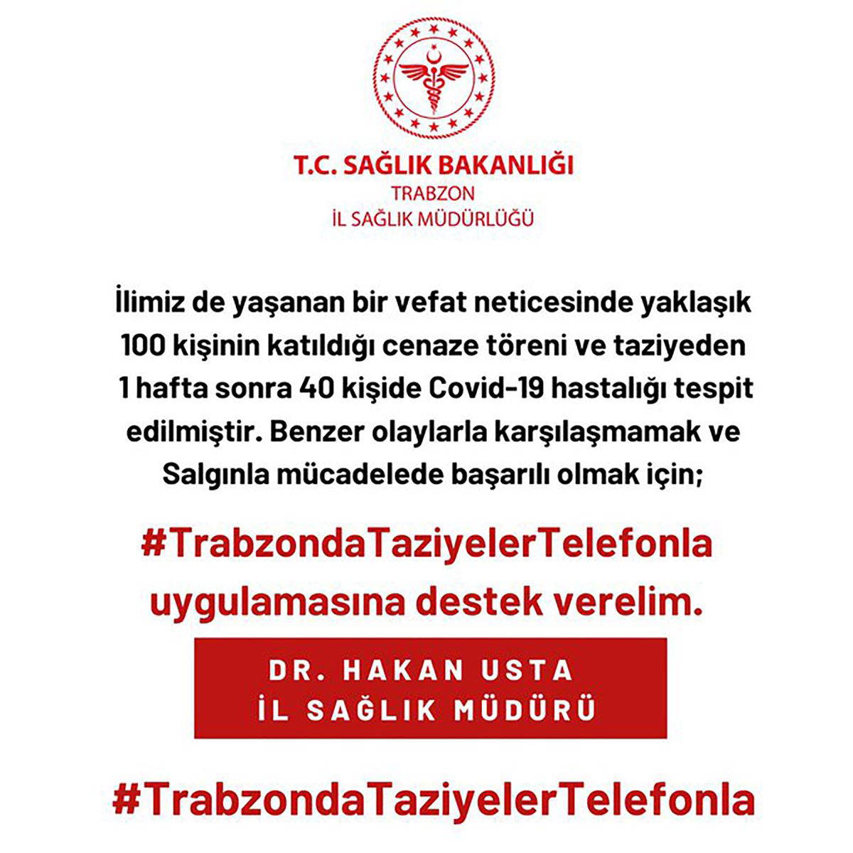 Trabzon İl Sağlık Müdürü Dr. Hakan Usta sosyal medya hesabından, "İlimizde yaşanan bir vefat neticesinde yaklaşık 100 kişinin katıldığı cenaze töreni ve taziyeden 1 hafta sonra 40 kişide Covid-19 hastalığı tespit edilmiştir. Benzer olaylarla karşılaşmamak ve salgınla mücadelede başarılı olmak için Trabzon'da taziyeler telefonla" paylaşımında bulundu.