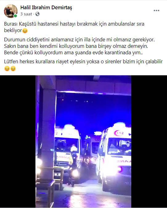 Kentte ailesiyle evinde karantinada olan iş insanı Halil İbrahim Demirtaş da, tedbirlere uymayanlara tepki göstererek, paylaşımında, “Burası Kaşüstü Hastanesi, hastaları bırakmak için ambulanslar sıra bekliyor. Durumun ciddiyetini anlamanız için illa içinde mi olmanız gerekiyor. Sakın bana ‘ben kendimi kolluyorum bana bir şey olmaz demeyin’ Ben de çünkü kolluyordum ama şu anda evde karantinadayım. Lütfen herkes kurallara riayet eylesin yoksa o sirenler bizim için çalabilir” ifadelerinde bulundu.