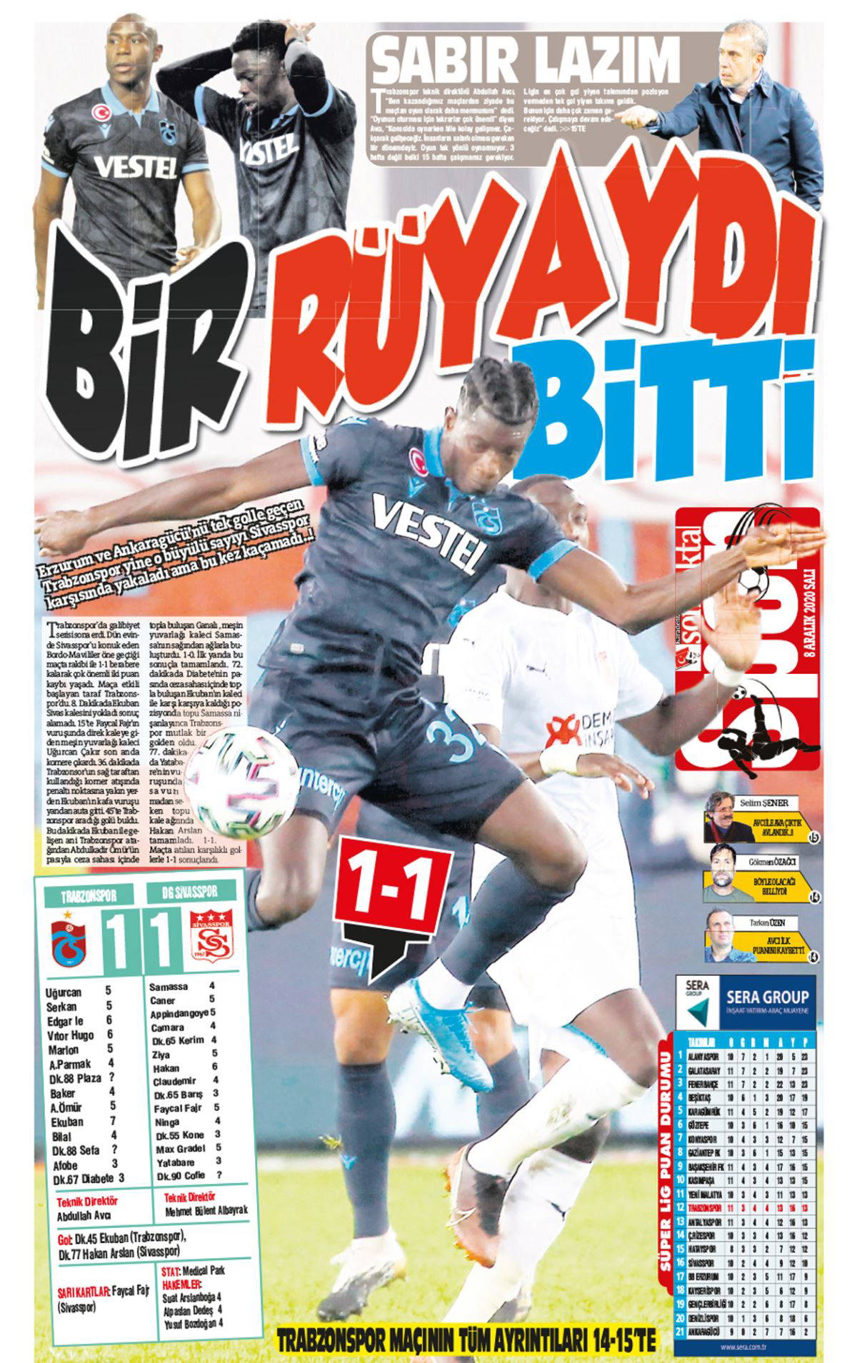 Diğer taraftan, yerel gazeteler, Trabzonspor’un Süper Lig’in 11’inci haftasında sahasında 1-1 berabere kaldığı Demir Grup Sivasspor maçının ardından ‘Rüya bitti’ ve ‘Bu takım ile bu kadar’ yorumlarını yaptı.
