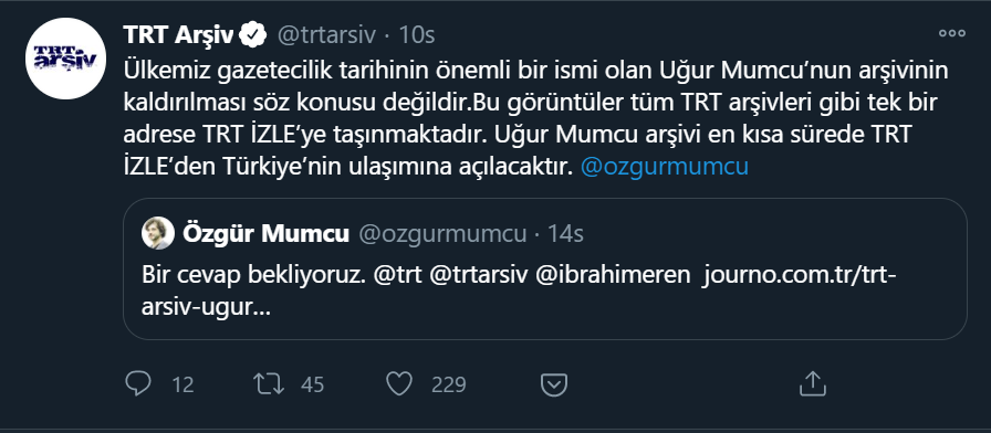 Tepkilerin büyümesi üzerine TRT, “Uğur Mumcu arşivi en kısa sürede TRT İzle’den Türkiye’nin ulaşımına açılacaktır” diye tweet attı.