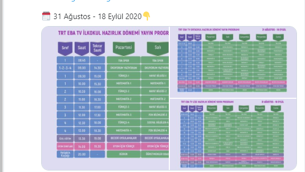 TRT EBA TV kanalları, sınıflara göre şöyle: