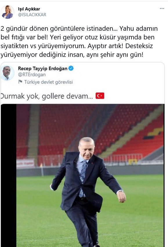 Söz konusu görüntüye "Erdoğan desteksiz yürüyemiyor" yorumunu yapan bir sosyal medya kullanıcısına yanıt TRT spikeri Işıl Açıklar'dan geldi.