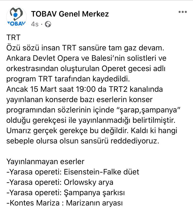 TOBAV Genel Merkezi tarafından yapılan açıklamada, ''Özü sözü insan TRT sansüre tam gaz devam. Ankara Devlet Opera ve Balesi’nin solistleri ve orkestrasından oluşturulan Operet Gecesi adlı program TRT tarafından kaydedildi. Ancak 15 Mart saat 19:00 da TRT 2 kanalında yayımlanan konserde bazı eserlerin konser programından sözlerinin içinde “şarap ve şampanya” olduğu gerekçesi ile yayımlanmadığı belirtilmiştir. Umarız gerçek gerekçe bu değildir. Kaldı ki hangi sebeple olursa olsun böyle bir sansürü reddediyoruz'' denildi.