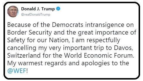 “Demokratların Sınır Güvenliği konusundaki inatçılığı ve ülkemizin güvenliği için İsviçre’nin Davos kasabasında düzenlenecek olan Dünya Ekonomik Forumu’na (WEF) katılmayacağımı üzülerek açıklıyorum. WEF’e en içten dileklerimi sunuyorum!”
