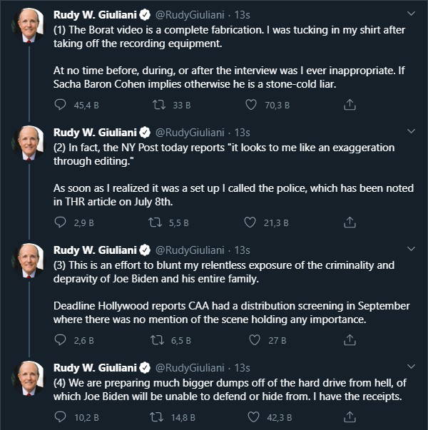 Giuliani bir başka Twitter mesajında, temmuzda yapılan röportajın önce ciddi olduğunu sandığını, "Tuzak olduğunu anlar anlamaz polis çağırdığını" belirterek bunun, "Joe Biden ve ailesinin suç işlemesi ve ahlaksızlığını teşhir etmeme yönelik köreltme çabası" olduğunu söyledi.