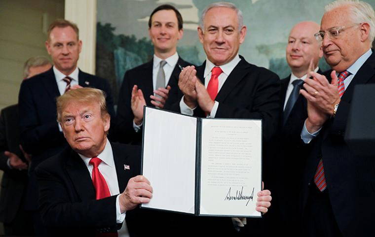 ABD Başkanı Donald Trump, "Golan Tepeleri üzerinde İsrail'in egemenliğini ABD'nin resmen tanıdığını" ilan eden başkanlık kararına imza attı.