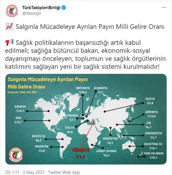 TTB'nin paylaşımındaki haritaya göre dünyada salgınla mücadeleye en yüksek bütçeyi, milli gelirinin yüzde 19.1'lik dilimine denk gelen Yeni Zellanda yaptı. Güney Afrika'nın salgınla mücadeleye ayırdığı pay milli gelire oranı yüzde 5.5 olurken, Türkiye'de bu oran yüzde 1.1 oldu. Salgın yönetiminde zorlu sınavda başarısız olan ülkelerin başında gelen ABD yüzde 16.7, Brezilya yüzde 8.3, İtalya ise yüzde 6.8 oldu.