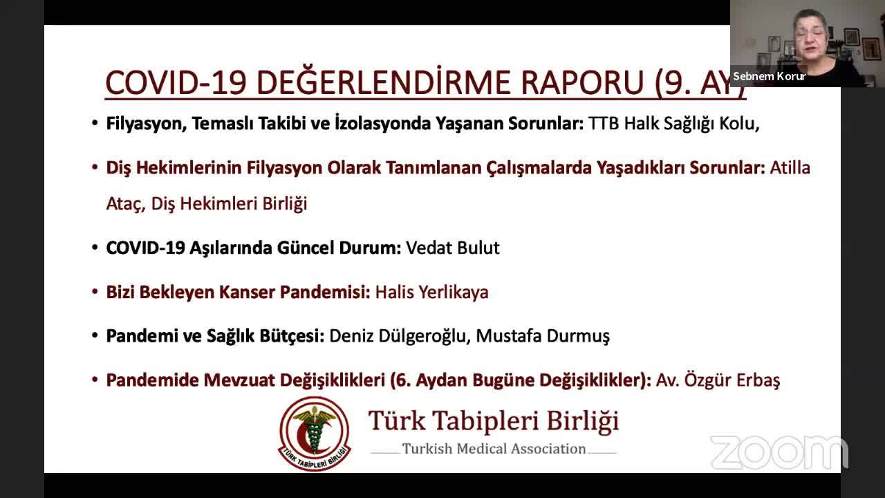 TTB koronavirüsü salgınının Türkiye’deki 9’uncu ayına ilişkin değerlendirme raporunu online basın toplantısı düzenleyerek açıkladı. Toplantıya, TTB Merkez Konseyi Başkanı Prof. Dr. Fincancı ve Genel Sekreter Prof. Dr. Vedat Bulut, Prof. Dr. Özlem Azap Kurt, Prof. Dr. Neyyire Yasemin Yalım, Covid-19 İzleme Kurulu Üyesi Özgür Karcıoğlu, Doç. Dr. Aslı Davas, TTB Merkez Konsey Üyesi Halis Yerlikaya katıldı.