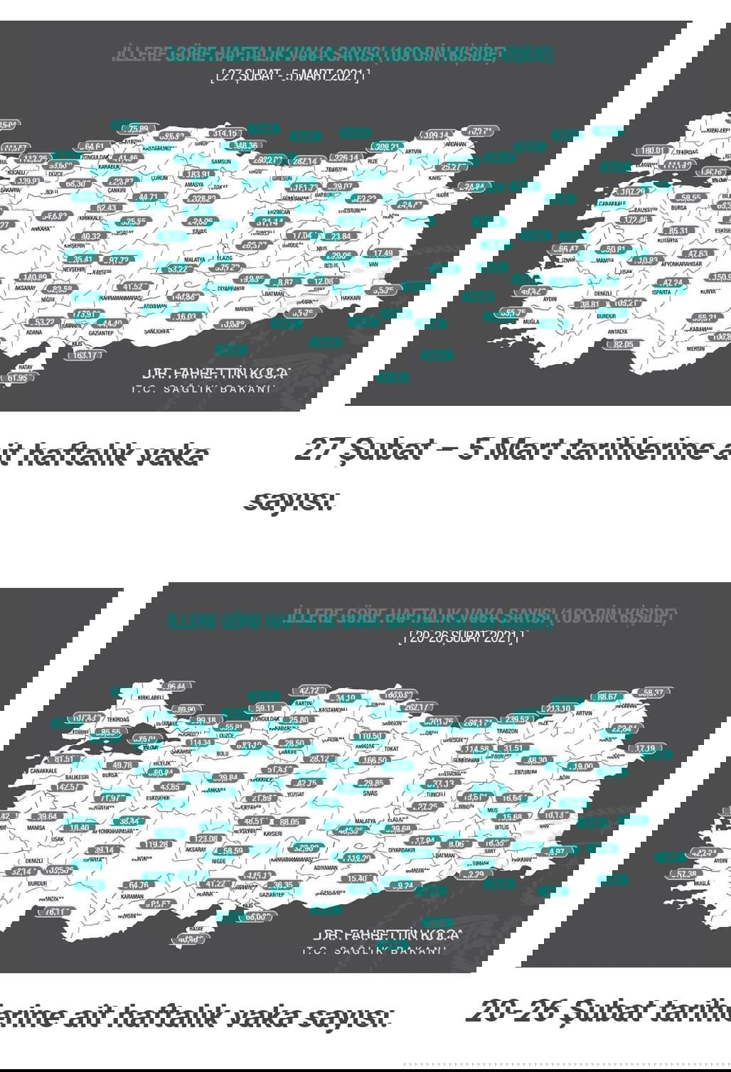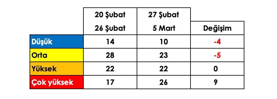 TTB'nin resmi Twitter hesabından yapılan paylaşımda "Son bir hafta içerisinde çok yüksek riskli il sayısı 17'den 26'ya çıktı. Çoğu ilimizde vakalarda yüzde 50-yüzde 100 arası artış var.