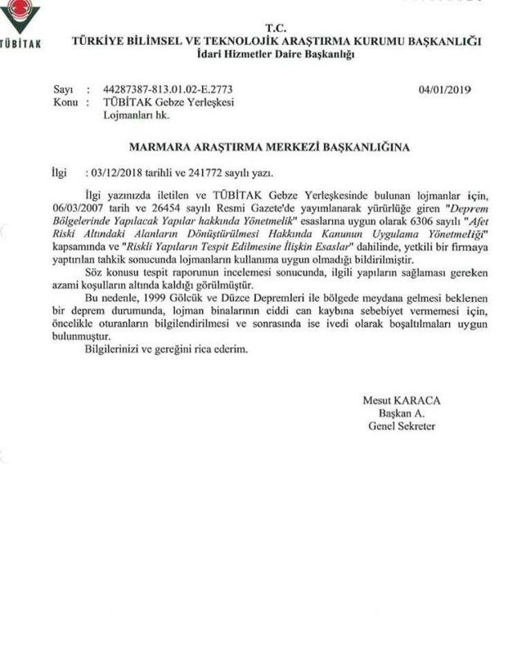 Sözcü'den Uğur Enç'in haberine göre, TÜBİTAK'ın gönderdiği yazıda dikkat çeken şu ifadeler yer aldı; “1999 Gölcük ve Düzce depremleri ile bölgede gelmesi beklenen bir deprem durumunda, lojman binalarının ciddi can kaybına sebebiyet vermemesi için, öncelikle oturanların bilgilendirilmesi ve sonrasında ise ivedi olarak boşaltılması uygun bulunmuştur.”