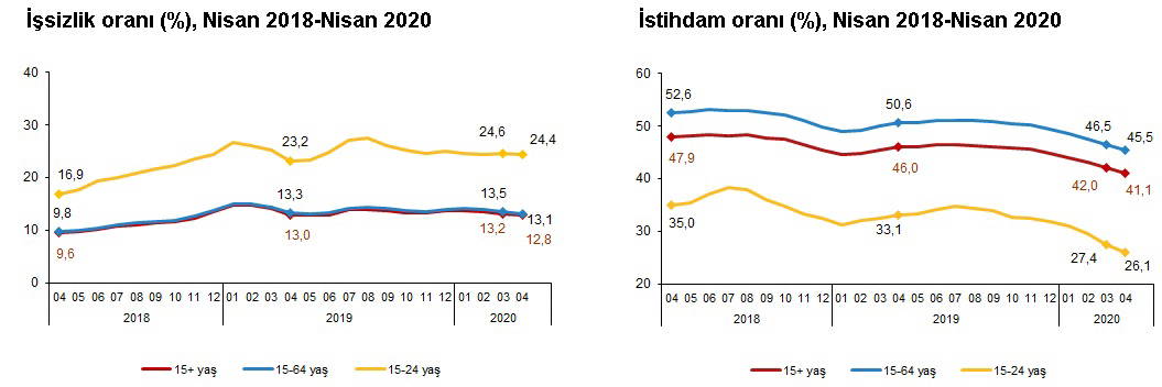 15-24 yaş grubunu kapsayan genç nüfusta işsizlik oranı bir önceki yılın aynı dönemine göre 1,2 puanlık artışla yüzde 24,4, istihdam oranı ise 7 puan azalarak yüzde 26,1 oldu. Aynı dönemde işgücüne katılma oranı 8,6 puanlık azalışla yüzde 34,5 seviyesinde gerçekleşti. Ne eğitimde ne de istihdamda olanların oranı ise bir önceki yılın aynı dönemine göre 5,7 puanlık artışla yüzde 29,1 seviyesinde gerçekleşti.