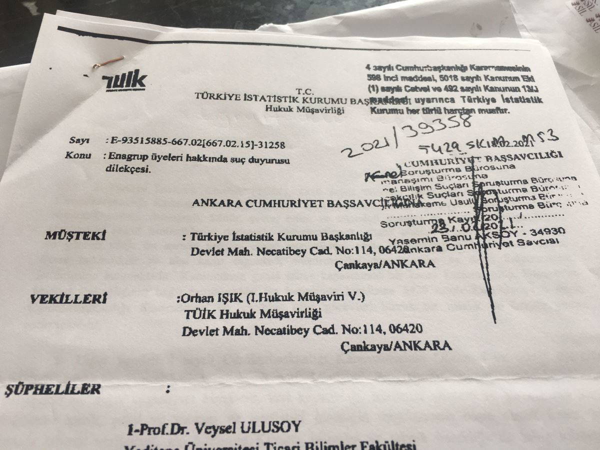 Türkiye İstatistik Kurumu’nun, bir grup akademisyen tarafından kurulan Enflasyon Araştırma Grubu (ENAG) hakkında Şubat 2021'de Ankara Cumhuriyet Başsavcılığı’na suç duyurusunda bulunduğu ortaya çıktı. Suç duyurusunun konusu ise 5429 sayılı Türkiye İstatistik Kanununun 6. maddesinin üçüncü fıkrası hükmüne muhalefet. Suç duyurusunun ise şubat ayında TÜİK başkanlığından alınan Muhammed Cahid Şirin'in yerine vekaleten atanan Ahmet Kürşad Dosdoğru döneminde yapıldığı ortaya çıktı.